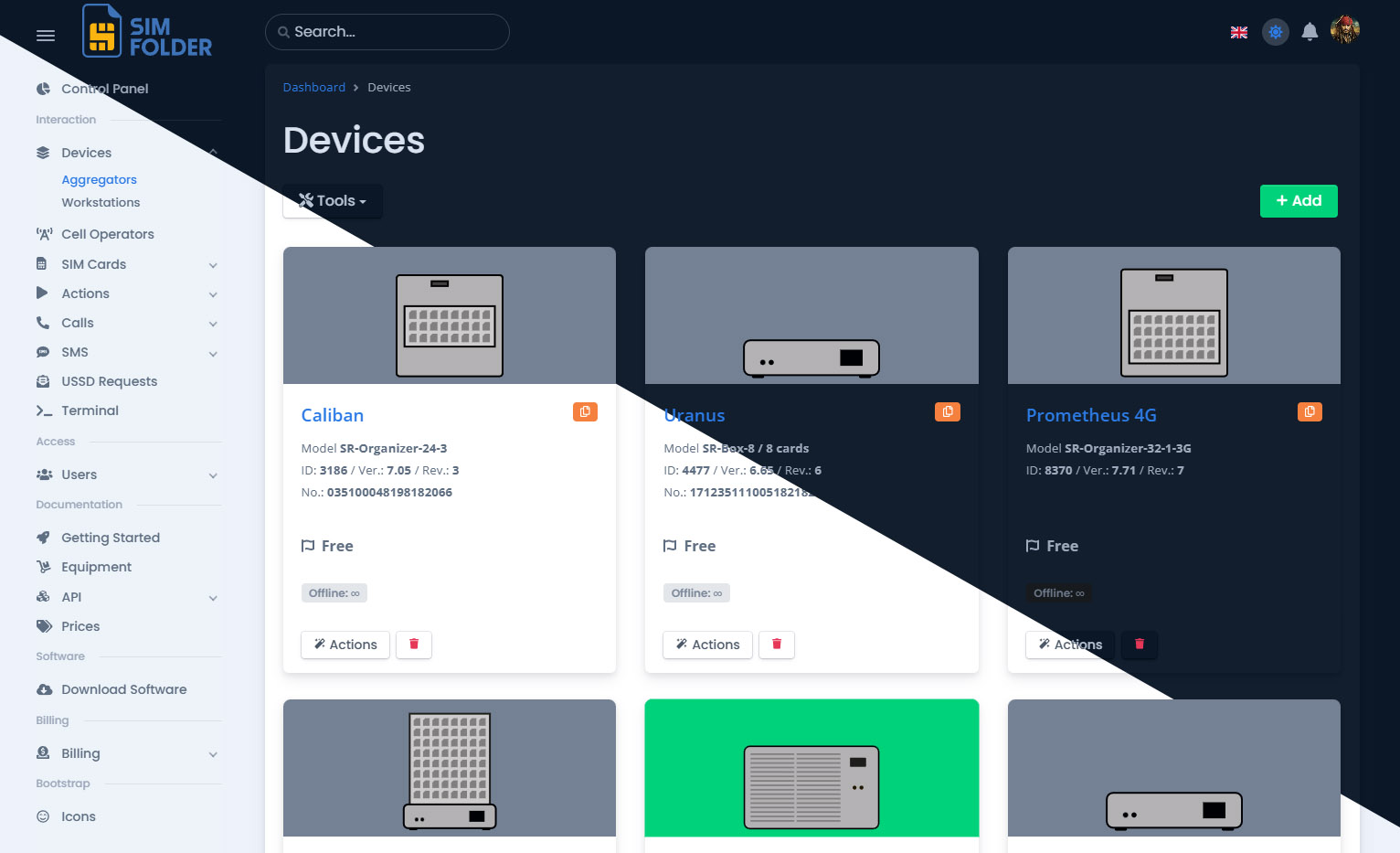 SimFolder is a modern web-based control panel for cellular and SIP telephony equipment, designed specifically for working with SIM aggregators: SIM banks, SIM boxes, modems, smartphones, as well as proprietary Sim Roulette devices. The panel provides a centralized interface for managing the entire infrastructure, automating tasks, and integrating with external services.