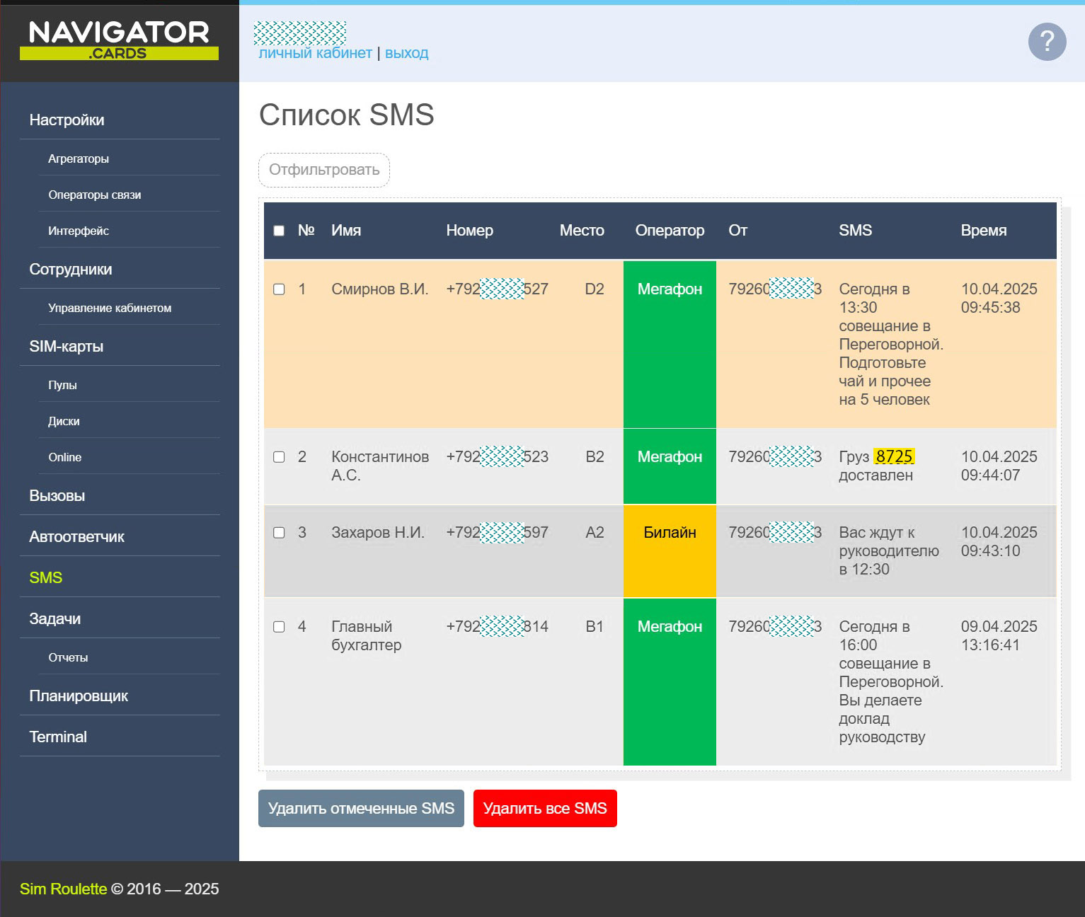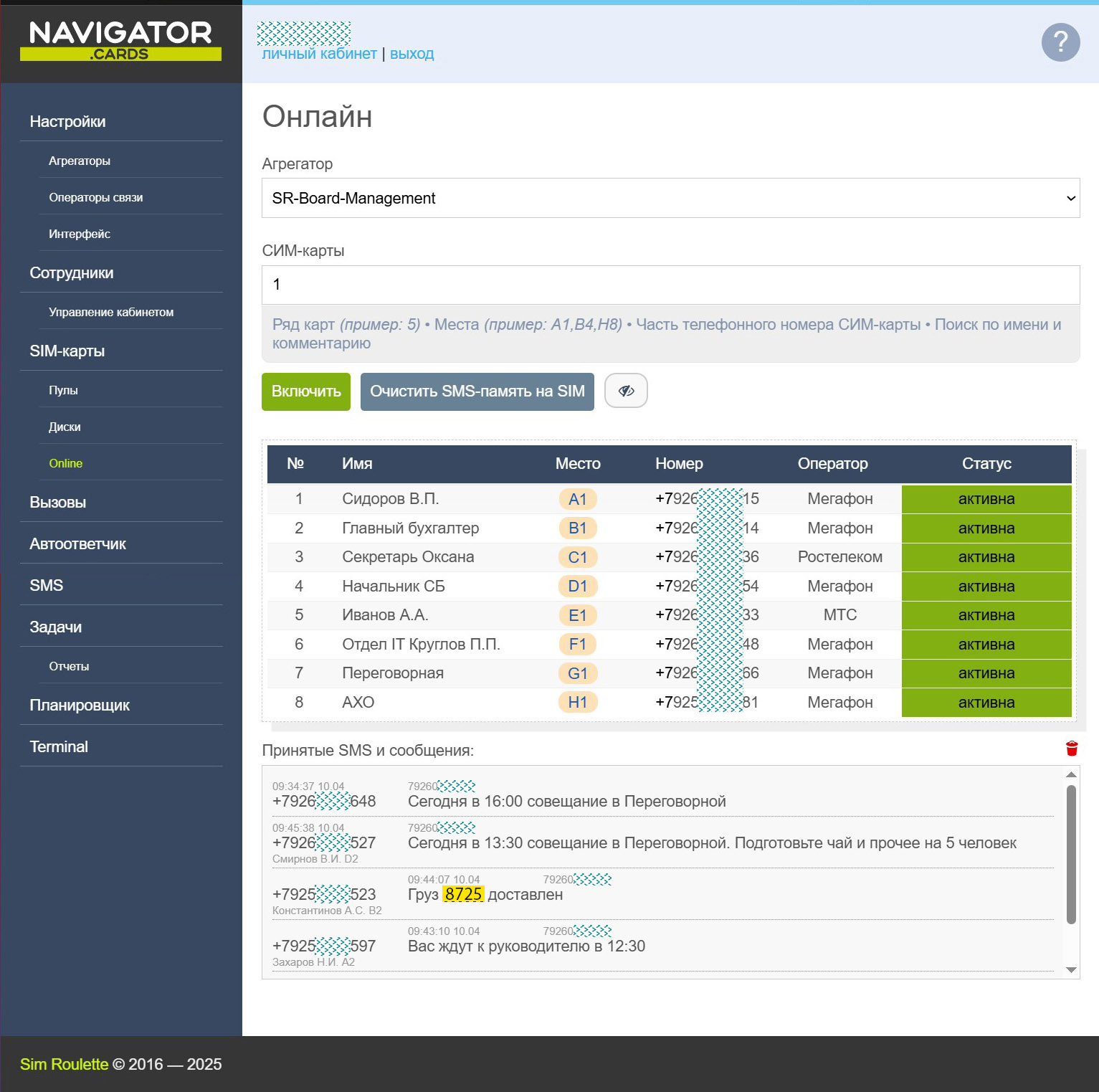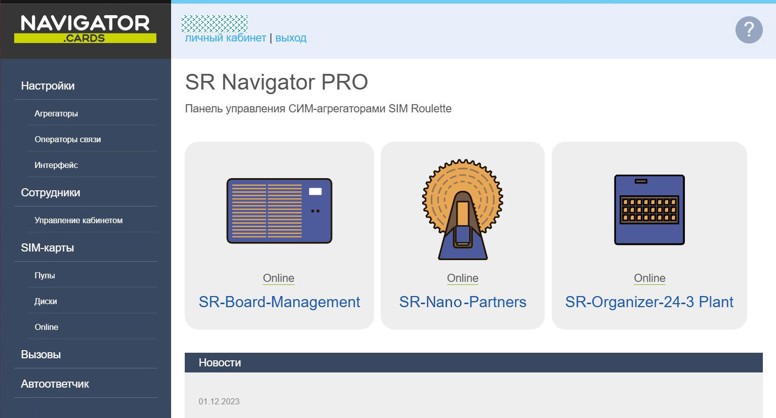 Для более сложных задач доступна расширенная версия — SR-Navigator PRO. Она включает многопользовательский доступ к SIM-картам, разграничение прав сотрудников, а также уведомления о входящих звонках и SMS через Telegram.
