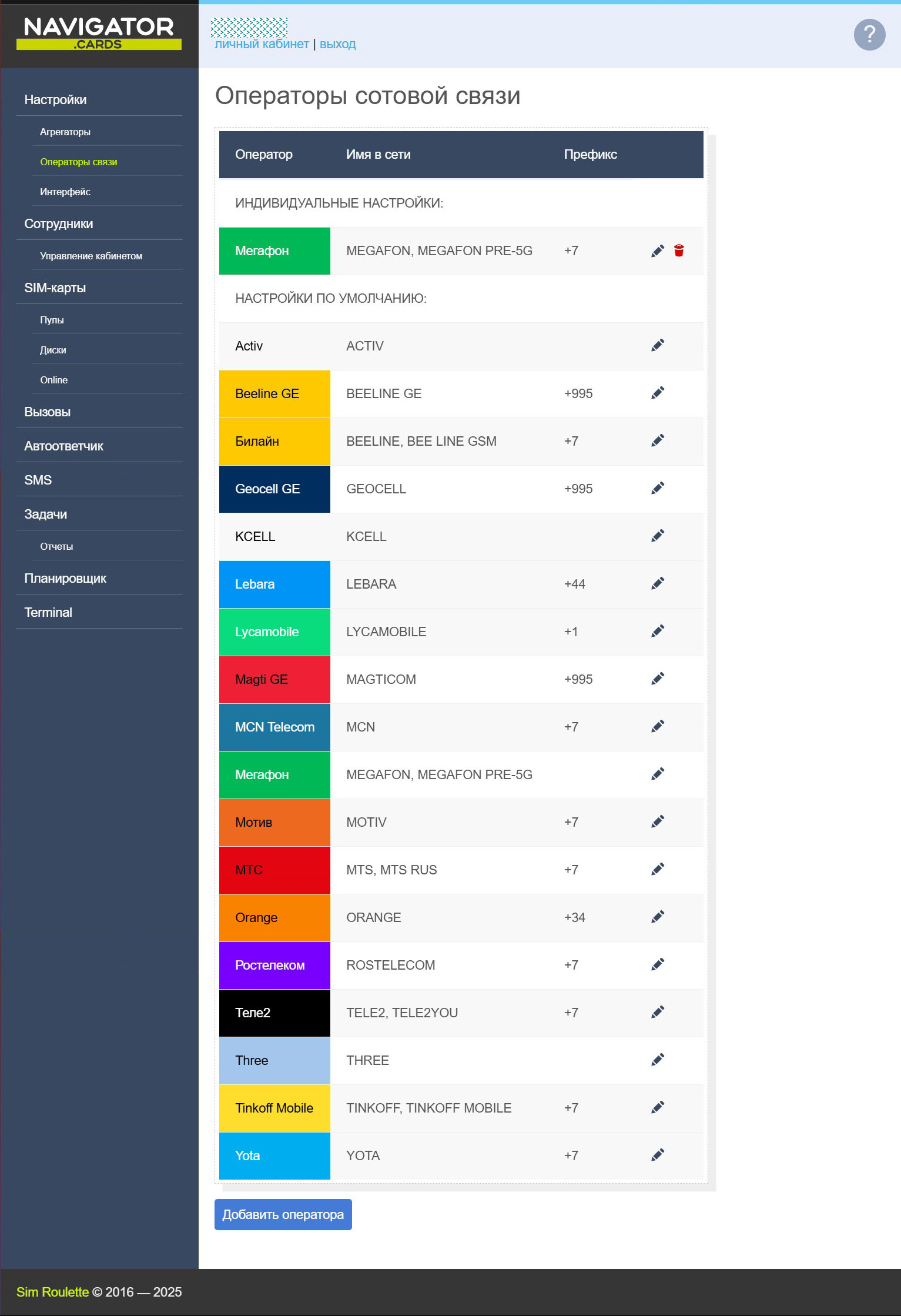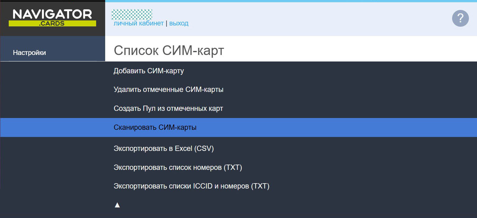 Список всех СИМ-карт пользователя
